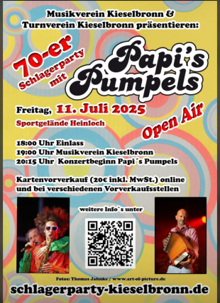 Wenn Kieselbronns Bürgermeister Heiko Faber als eingefleischter Pumpels-Fan sagt „Die Corona-Pandemie hat uns zwei Jahre Schlagerspaß genommen“ wird deutlich, mit welchen Schwierigkeiten die Veranstalter der geplanten Schlagerparty in Flehingen zu kämpfen hatten. Die Party hätte ursprünglich zum 100-jährigen Jubiläum des FC Flehingen steigen sollen. Der FC Flehingen und der Musikverein Kieselbronn sind in diesem Jahr zuversichtlich, dass die Schlagerparty mit der mittlerweile durch die Veranstaltungen in Kieselbronn auch in unserer Region bekannten und überaus beliebten Band Papi’s Pumpels vom Bodensee am Freitag, 8. Juli 2022 endlich stattfinden kann.